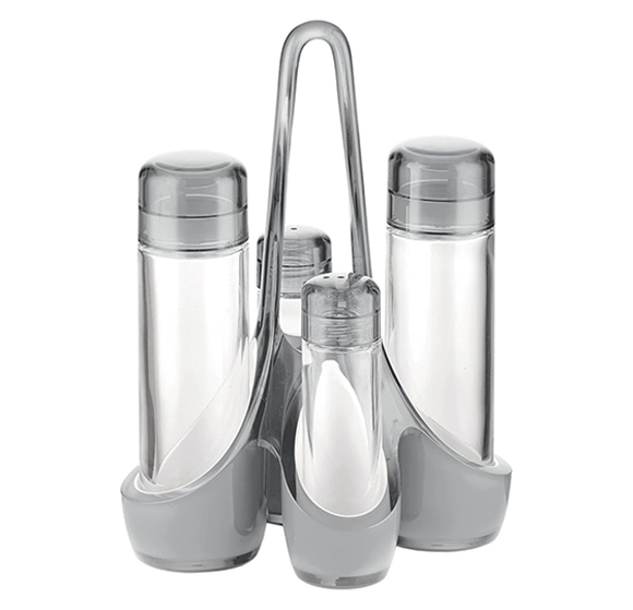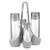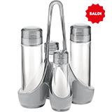 - Contenuto del set: 2 ampolle con dosatore taglia goccia e tappo antipolvere, saliera e pepiera, base di traporto a maniglia larga