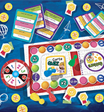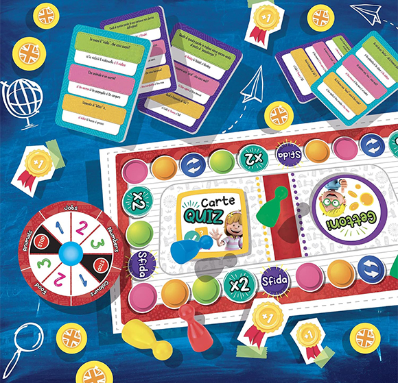 • Include: 1 plancia di gioco, 1 spinner, 16 gettoni tondi, 12 coccarde, 27 carte speciali, 4 birilotti