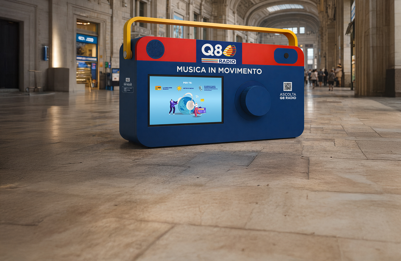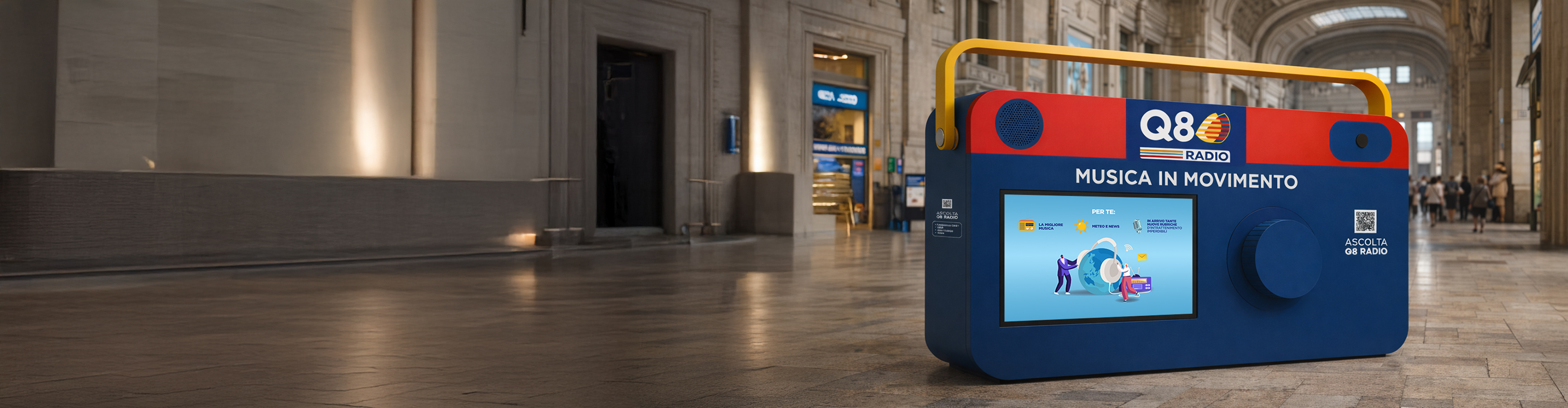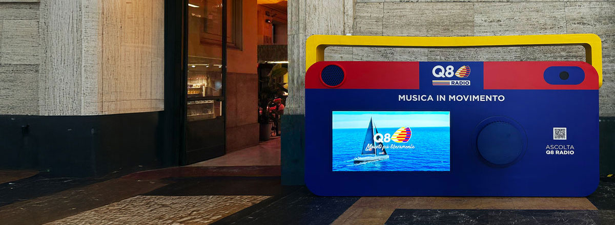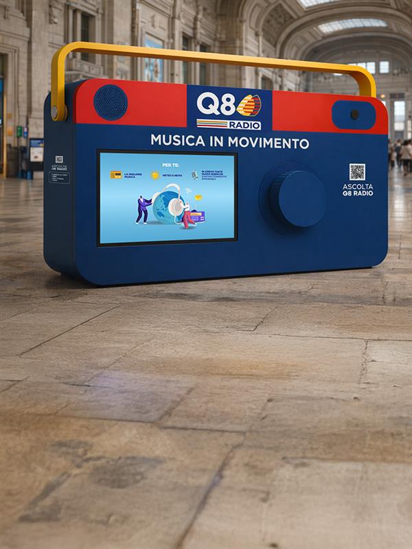 Q8 Radio ha preso vita nelle stazioni di Milano Centrale e Roma Termini con un’iconica radio gigante, che ha incontrato ogni giorno migliaia di viaggiatori.